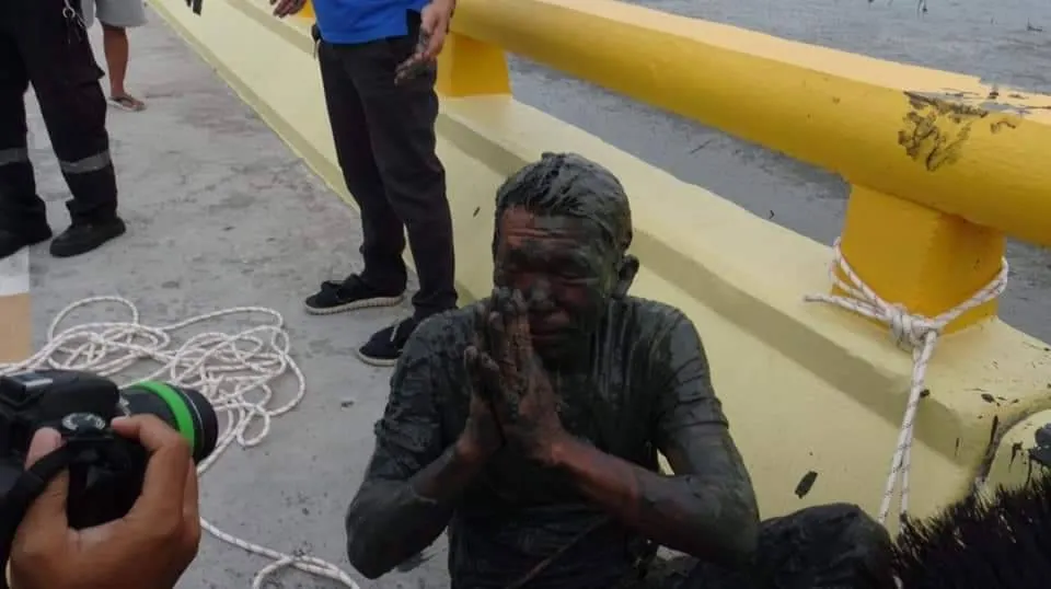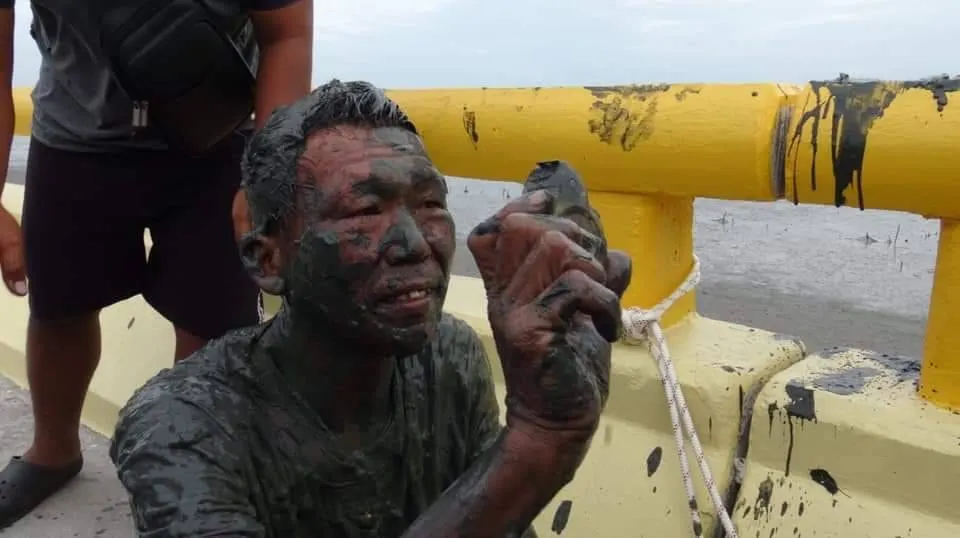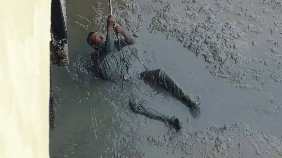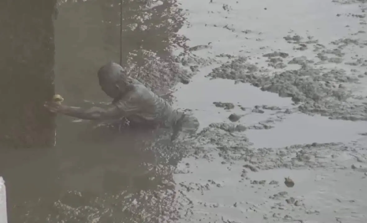นายนพพร พ่วงรักษา อายุ 41 ปี ชาวบางละมุง จ.ชลบุรี จมอยู่ในโคลนใต้สะพาน สภาพเนื้อตัวมอมแมม ชาวบ้านต่างหาวิธีพยายามช่วยเหลือ