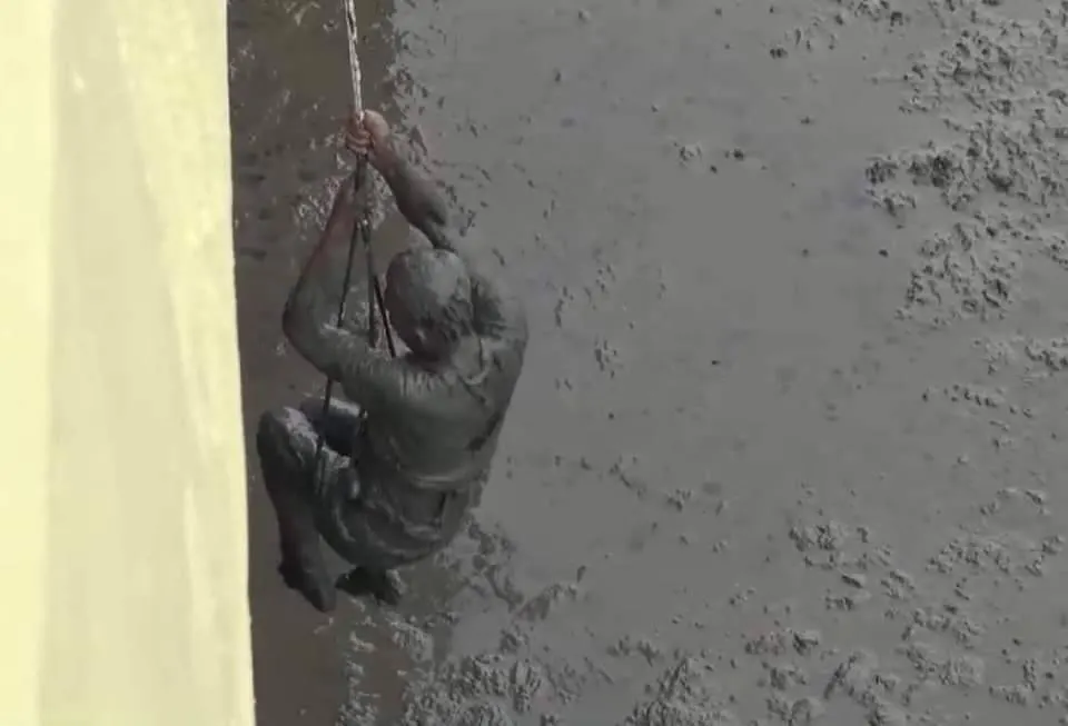 เจ้าหน้าที่กู้ภัย ใช้เชือกโยนลงไป ให้มัดตัวเอาไว้ แล้วช่วยกันออกแรงดึง ขึ้นมาได้สำเร็จ ใช้เวลากว่า 40 นาที สภาพเปื้อนโคลนอย่างที่เห็นในภาพ