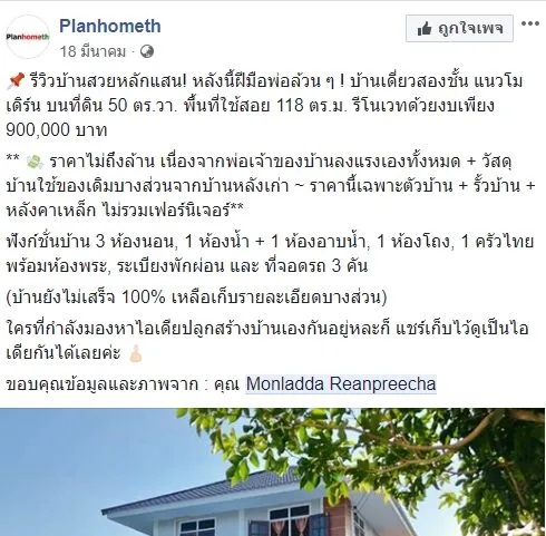 ราคาไม่ถึงล้าน เนื่องจากพ่อเจ้าของบ้านลงแรงเองทั้งหมด + วัสดุบ้านใช้ของเดิมบางส่วนจากบ้านหลังเก่า ~ ราคานี้เฉพาะตัวบ้าน + รั้วบ้าน + หลังคาเหล็ก ไม่รวมเฟอร์นิเจอร์”
