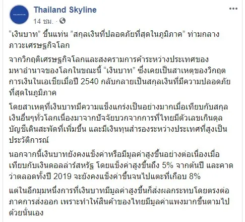 เฟซบุ๊กแฟนเพจไทยแลนด์ สกายไลน์เปิดเผยว่า ค่า“เงินบาท” ถูกยกให้เป็น ”สกุลเงินที่ปลอดภัยที่สุดในภูมิภาค” ท่ามกลางภาวะเศรษฐกิจโลกที่ผันผวน