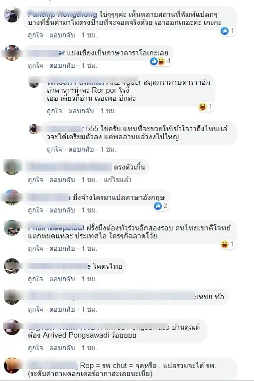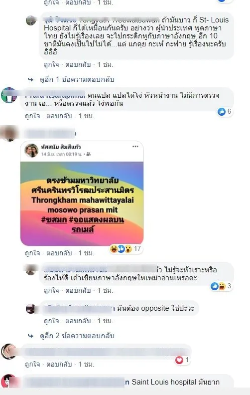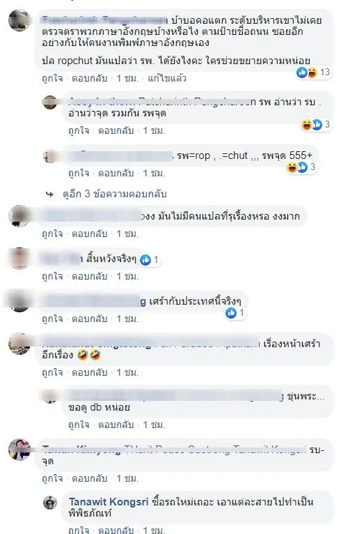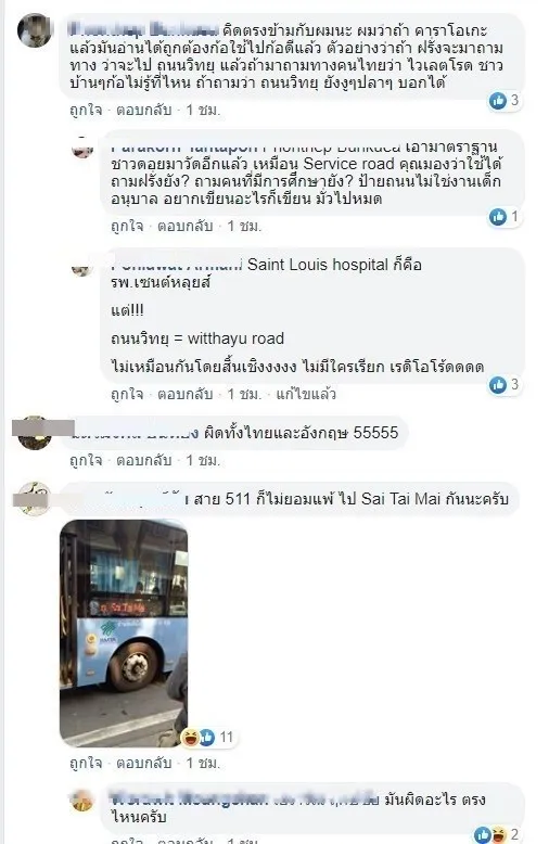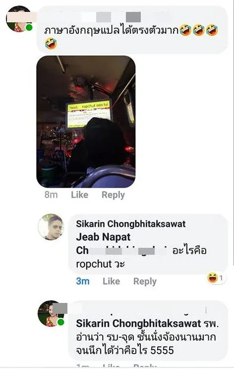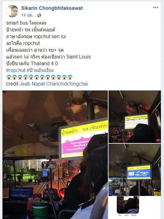 ทั้งนี้ผู้โพสท์ยังโพสท์ข้อความระบุว่า smart bus ไหมหล่ะป้ายหน้า รพ.เซ็นต์หลุยส์ ภาษาอังกฤษ ropchut sen lui อะไรคือ ropchut เพื่อนเฉลยว่า อ่านว่า รบ+ จุด แล้ว sen lui จริงๆ ต้องเขียนว่า Saint Louis ปังปินาดกับ Thailand 4.0
