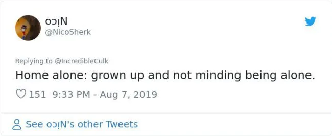 Home Alone เป็นภาพยนตร์ที่ยอดเยี่ยมที่สุดจัดได้ว่าเป็นภาพยนตร์ที่ทำเงินได้ตลอดกาลอีกเรื่องหนึ่ง เนื้อเรื่องก็คือ เควิน (แม็กเคาลย์ คัลกิน) เมื่อต้องอยู่ภายในบ้านเพียงลำพัง เนื่องจากทุกคนในบ้านต่างกระตือรือร้นในการไปเที่ยวในช่วงวันหยุดคริสต์มาส เมื่ออยู่ตามลำพังแล้ว เควินได้จัดการแต่งบ้านเสียใหม่ เพื่อฉลองเทศกาลให้กับตัวเอง โดยมีโจรซื่อบื้อ 2 นาย พยายามที่จะ เข้ามาภายในบ้าน โดยไม่รู้อนาคตของตัวเอง ในที่สุดทั้งสองก็ต้องมาตกหลุมที่หนุ่มน้อยเควินได้ขุดล่อเอาไว้ เรียกได้ว่าเป็นภาพยนตร์ที่เอาชนะใจคนดูด้วยความน่ารักของแม็กเคาลย์ในวัยเยาว์เป็นอย่างมาก แต่ไม่เพียงแค่ในวัยเยาว์เท่านั้น ตอนนี้เขายังเอาชนะใจผู้คนด้วยการสร้างทวิตที่เรียกเสียงฮาได้อีกครั้งนึง