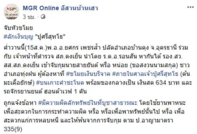 เมื่อวันที่ 15 สิงหาคม เพจ MGR Online อีสานบ้านเฮา ได้โพสต์ข้อความระบุว่า จับหัวขโมย ลักเงินบุญ ปูศรีสุทโธ ค่ำวานนี้(15ส.ค.)พ.อ.อ.ยศกร เพชรล้ำ ปลัดอำเภอบ้านดุง จ.อุดรธานี ร่วมกับ เจ้าหน้าที่ตำรวจ สภ.ดงเย็น นำโดย ร.ต.อ.รอนสัน หากันได้ รอง.สว.สส.สภ.ดงเย็น เข้าจับกุมนายสายยันต์ หรือ หน่อย (ขอสงวนนามสกุล) ชาวอำเภอทุ่งฝน ผู้ต้องหาที่ ขโมยเงินบริจาค ภายในศาลเจ้าปู่ศรีสุทโธ (ต้นมะเดื่อยักษ์) บนเกาะคำชะโนด พร้อมของกลางเป็น เงินสด 634 บ. และ รถจยย. ฮอนด้าเวฟ 1 คัน ถูกแจ้งข้อหา มีความผิดลักทรัพย์ในที่บูชาสาธารณะ โดยใช้จยย.เป็นพาหนะเพื่อสะดวกในการกระทำความผิด หรือ เพื่อพาทรัพย์นั้นไป หรือ เพื่อสะดวกแก่การหลบหนี และให้พ้นจากการจับกุม ตาม ป.อาญามาตรา 335(9)