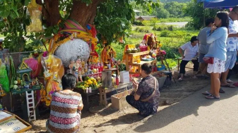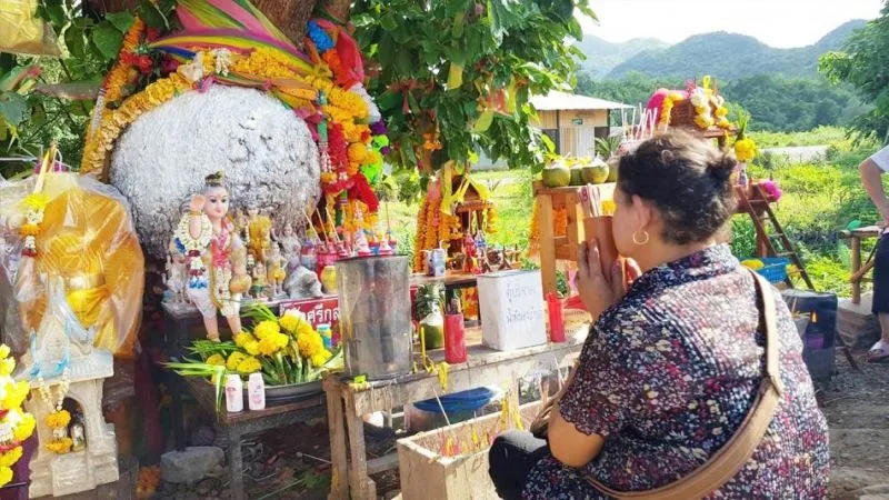 เมื่อวันที่ 15 ส.ค. 62 ที่ถนนสายกาญจนบุรี-ไทรโยค ช่วงก่อนถึงสามแยกบ้านเก่า พื้นที่หมู่ 5 ต.หนองบัว อ.เมือง จ.กาญจนบุรี มีบรรดาคอหวย นักเสี่ยงโชคมาหาเลขเด็ด จากต้นยอป่าตั้งท้อง โดยต้นยอที่มีลักษณะคล้ายหญิงสาวท้องแก่ หลังมีกระแสร่ำลือว่า ต้นยอป่าตั้งท้องนี้ มีสิ่งศักดิ์สิทธิ์สิงสถิตอยู่ และมักจะให้โชคลาภกับคนที่มากราบไหว้บูชา