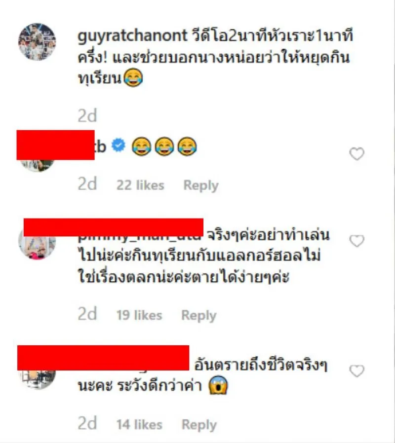 หลังจากโพสต์คลิปได้ไม่นาน มีแฟนคลับหลายคนเข้ามาคอมเมนต์แสดงความเป็นห่วงจำนวนมาก พร้อมทั้งแนะนำว่า ให้เชื่อสามี อย่ากินทุเรียนกับแอลกอฮอล์เพราะอาจจะทำให้แน่นหน้าอกได้จริงๆ