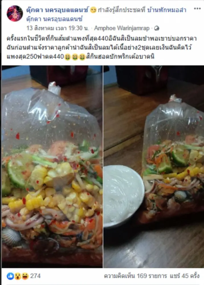 จากกรณีผู้ใช้เฟซบุ๊กชื่อ ตุ๊กตา นครอุบลแดนซ์ ได้โพสต์ภาพถุงส้มตำรวมและขนมจีน 1 ถ้วย โดยระบุข้อความว่า ครั้งแรกในชีวิตที่กินส้มตำแพงที่สุด440อิฉันสิเป็นลมชำพอเขาบ่บอกราคาฉันก่อนตำแจ้งราคาลูกค้านำฉันสิเป็นลมได้เนื้ อย่าง2ชุดเลยเงินฉันคิดไว้แพงสุด250ฟาดด440สิกินฮอดบักพริกเด้อบาดนิ