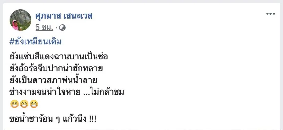 #ยังเหมียนเดิม ยังแซ่บสีแดงฉานบานเป็นช่อ ยังอ้อร้อจีบปากน่าฮักหลาย ยังเป็นดาวสภาพ่นน้ำลาย ช่างงามจนน่าใจหาย …ไม่กล้าชม