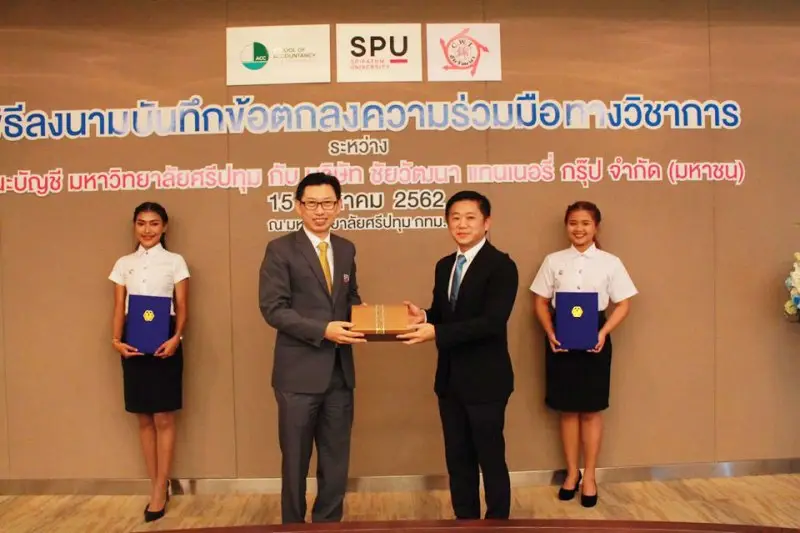 คณะบัญชี มหาวิทยาลัยศรีปทุม จัดให้มีพิธีลงนามบันทึกข้อตกลงความร่วมมือทางวิชาการ ระหว่างมหาวิทยาลัยศรีปทุม และ บริษัท ชัยวัฒนา แทนเนอรี่ กรุ๊ป จำกัด (มหาชน) โดย ผศ.ดร.วิรัช เลิศไพฑูรย์พันธ์ รองอธิการบดี มหาวิทยาลัยศรีปทุม, ผศ.ดร.ฐิตาภรณ์ สินจรูญศักดิ์ คณบดีคณะบัญชี SPU กับ นายวีระพล ไชยธีรัตต์ กรรมการผู้จัดการ บริษัท ชัยวัฒนา แทนเนอรี่ กรุ๊ป จำกัด (มหาชน , นางสาวสมฤทัย ไพฑูรย์รังสฤษดิ์ ผู้จัดการทั่วไปการเงินและบัญชี บริษัท ชัยวัฒนา แทนเนอรี่ กรุ๊ป จำกัด (มหาชน) ร่วมลงนามบันทึกข้อตกลงความร่วมมือทางวิชาการ ในครั้งนี้ ณ ห้องบอร์ดรูม ชั้น 14 อาคาร 11 มหาวิทยาลัยศรีปทุม กทม.(บางเขน)