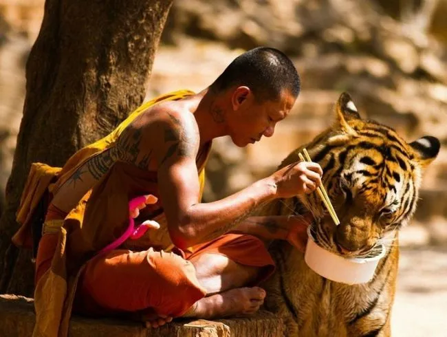 6 ความเมตตาของพระภิกษุที่มีต่อผู้คนและสัตว์ทั้งหลาย ท่านกำลังป้อนอาหารให้แก่เสือ เป็นภาพที่ทำให้เราสุขใจจริงๆ