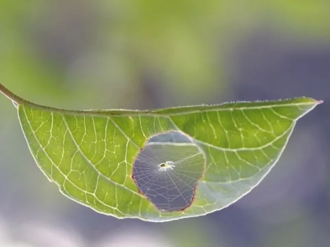 11 แมงมุมตัวนี้สร้างใยแมงมุมที่รูในใบไม้ !