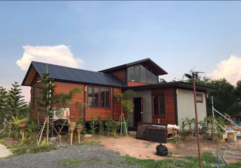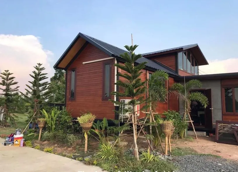 บ้านหลังนี้มี หนึ่งห้องนอน หนึ่งห้องน้ำ และสองห้องรับแขก พร้อมมีอีกหนึ่งห้องครัว โดยมองได้เดินเข้ามาสิ่งแรกที่คุณสัมผัสได้เลยคือ กลิ่นอายของความสงบและโล่งโปร่ง เพราะบริเวณรอบตัวบ้านมีการปลูกต้นไม้ประดับ เพื่อมความร่มรื่นให้กับตัวบ้าน หลังคาของบ้านหลังนี้เลือกคาใช้โทนสีเข้ม โดยเลือกหลังคาแบบเมทัลชีท โครงสร้างของตัวบ้านเป็นเหล็ก ผนังเป็นไม้