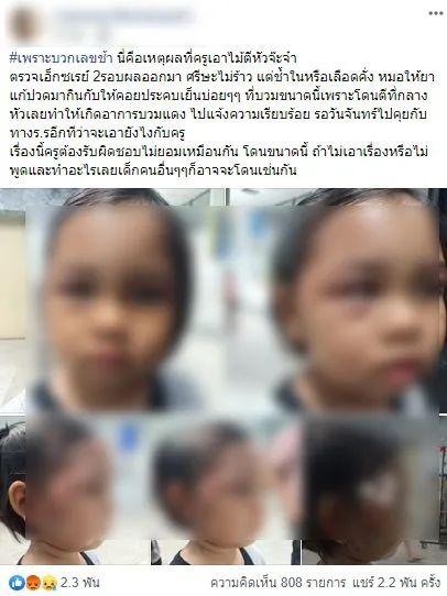 17 ส.ค. มีหญิงสาวรายหนึ่งออกมาโพสต์ภาพใบหน้าของลูกสาวตัวเอง มีรอยเขียวช้ำบนใบหน้าอย่างเห็นได้ชัด ตาทั้ง 2 ข้างปิด โดยหญิงสาวคนได้กล่าวได้ระบุว่า “เพราะบวกเลขช้า นี่คือเหตุผลที่ครูเอาไม้ตีหัวลูก ตรวจเอ็กซเรย์ 2รอบผลออกมา ศีรษะไม่ร้าว แต่ช้ำในหรือเลือดคั่ง