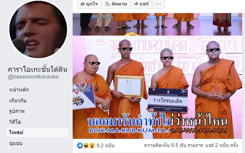 ด้านทางเพจ คาราโอเกะชั้นใต้ดิน ก็นำมาภาพนี้มาแชร์จนลูกเพจ วิจารณ์ไปต่างๆ นาๆ บ้างก็ว่า " น่าจะแข่งพับจีด้วย พับจีวรอะ..ปัจจัย = สกินฮีโร่...จินน่า รูนหลวงปู่เค็มกันเวทย์ 300 กองไฟร๊อคซี่ 8 เมตร ประทานโทษ พุธธังอารัททนานัง สังฆังอารัททนานนัง "