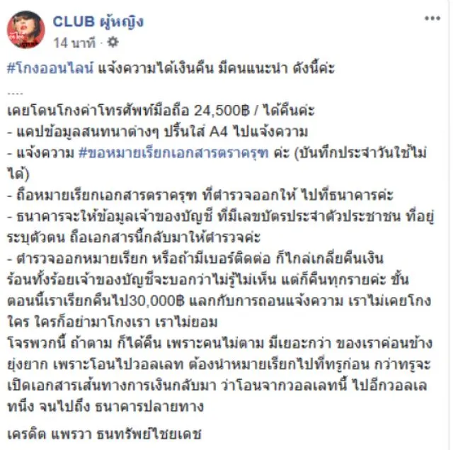 เพราะยุคนี้เป็นยุค 4 G การซื้อขายสินค้าออนไลน์จึงเป็นที่นิยมกันอย่างแพร่หลาย เพราะว่ามีความสะดวกสบาย ไม่ต้องออกไปเดินเลือกซื้อของ ให้เมื่อยเพียงแค่นอนดูไลฟ์สดอยู่ที่บ้าน หรือเลือกสินค้าใส่ตระกร้านอนรอรับของอยู่ที่บ้านได้เลย แต่ก็มีมิจฉาชีพบางคนแอบแฝงมาหลอกโอนเงินแล้วไม่ส่งของให้ลูกค้า วันนี้เราก็มีวิธีแก้เผ็ดพวก 18 มงกุฏ มาแนะนำสำหรับคนที่โดนโกง เมื่อวันที่ 19 สิงหาคม เพจ CLUB ผู้หญิง ได้โพสต์ระบุข้อความว่า โกงออนไลน์ แจ้งความได้เงินคืน มีคนแนะนำ ดังนี้ค่ะ