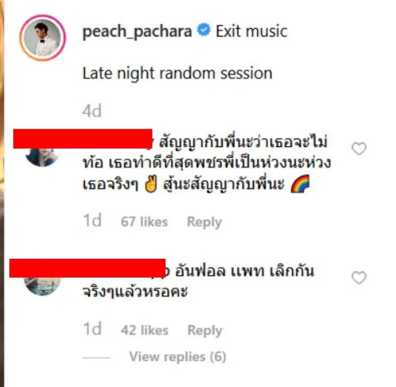 โดยเมื่อไปส่องอินสตาแกรมส่วนตัวของ พีช พชร พบว่า หนุ่ม พีช โพสต์คลิปเล่นกีต้าร์ และ ร้องเพลง โมเมนต์สุดเศร้า พร้อมแคปชั่นว่า Exit music Late night random session ยิ่งหลังมีภาพหลุด ของฝ่ายหญิงกับไฮโซหนุ่มโน้ต ทำเอาแฟนคลับและคนเข้ามาคอมเมนต์จำนวนมาก ให้กำลังใจ พีช บางคนดูคลิปแล้วก็อินบอกว่าร้องไห้ตามไปด้วย หลายคนอินหนัก ประกาศเลิกตาม นางเอก แพทริเซีย ด้วย
