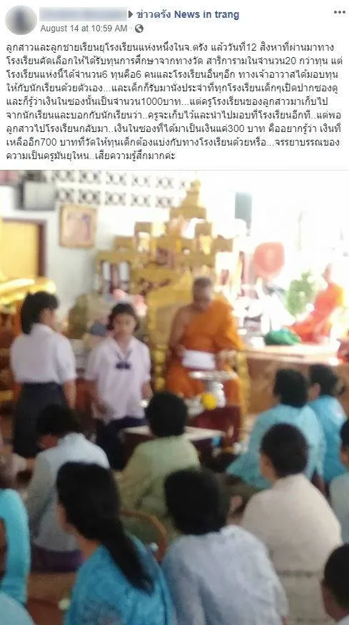 จากกรณีที่ผู้ปกครองนักเรียนโรงเรียนเอกชนแห่งหนึ่ง ใน อ.เมือง จ.ตรัง โพสต์ร้องเรียนว่า ถูกผู้อำนวยการโรงเรียนหักค่าเงินทุนการศึกษาที่ได้รับจากวัดสาริการาม มอบเป็นทุนการศึกษาให้กับเด็กนักเรียนที่เรียนดีแต่ยากจน เนื่องในวันแม่แห่งชาติ 12 สิงหาคม 2562 โดยเดิมที เด็กต้องได้ทุน 1,000 บาท แต่ ผอ. มอบให้เด็ก 300 บาท และพบว่ากรณีนี้เกิดขึ้นมาหลายปีแล้วนั้น