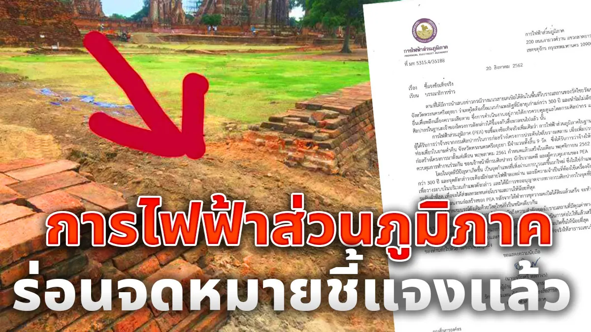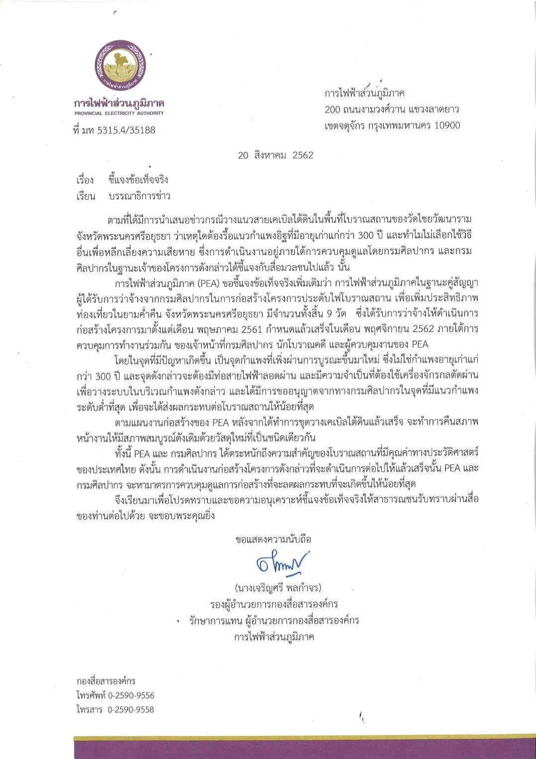 การไฟฟ้าส่วนภูมิภาค (PEA) ชี้แจงกรณีการวางสายเคเบิลใต้ดินในพื้นที่โบราณสถานของวัดไชยวัฒนาราม จังหวัดพระนครศรีอยุธยาว่าเหตุใดต้องรื้อแนวกำแพงอิฐที่มีอายุเก่าแก่กว่า 300 ปี ไม่เลือกใช้วิธีอื่นเพื่อหลีกเลี่ยงความเสียหาย ซึ่งกรมศิลปากรควบคุมดูแลการดำเนินงานในฐานะเจ้าของโครงการดังกล่าวชี้แจงกับสื่อมวลชนไปแล้ว นั้น