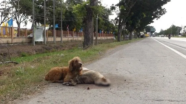 สุนัขโดนรถชนตาย อีกตัวนั่งเฝ้าไม่ห่าง ไม่ให้ใครเข้าใกล้