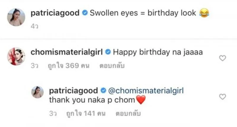 และก่อนที่เรื่องจะเฉลย ในงานวันเกิดของสาวแพทริเซีย ที่นางเอกรุ่นน้องได้โพสต์รูปตัวเองกับเค้กวันเกิด สาวชมพู่ ก็ได้เข้าไปคอมเมนต์อวยพรวันเกิดนางเอกรุ่นน้องอีกด้วย แต่ไม่ได้มีแค่สาวชมพู่เท่านั้น เพราะยังมีคนในวงการบันเทิงจำนวนมากอย่าง แต้ว ณฐพร, ปันปัน สุทัตตา, คิมเบอร์ลี่, เดียร์น่า ฟลีโป เข้าไปคอมเมนต์ร่วมอวยพรเช่นกัน