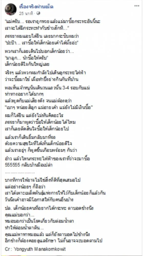 เมื่อวันที่ 22 ได้มีการแชร์เรื่องราวที่น่าประทับใจมาก เป็นเรื่องราวของหนูน้อยรายหนึ่งที่มาเดินห้างกับคุณแม่ แต่ทว่าคุณแม่ของหนูน้อยรายนี้ก็ไม่ค่อยจะมีเงินพอที่จะซื้อของที่ต้องการนั่นก็คือกระทะไฟฟ้า เพจ เรื่องจริงผ่านเน็ต ได้โพสต์ข้อความระบุว่า แม่ครับ รอเราถูกหวยแล้วแม่มาซื้อกระทะอันนี้นะ เราจะได้มีกระทะทำกับข้าวสักที แฟนผมแอบได้ยิน เลยมากระซิบผมว่า ปะป๊าเราซื้อให้เด็กน้อยเค้าได้ไหม พวกเราก็เลยเดินไปบอกเด็กน้อยว่า มาลูก น้าซื้อให้ครับ เด็กน้อยดีใจกันใหญ่เลย