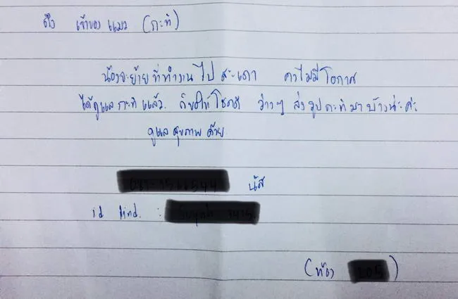 โดยเขายังบอกอีกว่า ยังไงก็ขอบคุณ ที่เอ็นดูกะทิคอยดูแลให้ยามที่เราไม่อยู่ห้อง ขอให้น้องโชคดี ประสบความสำเร็จในชีวิตแล้วจะคอยส่งรูปกะทิ ไปให้ดูเรื่อยๆ ขอบคุณและโชคดีครับ โดยข้อความในจดหมายเขียนไว้ว่า “ถึงเจ้าของแมว (กะทิ) น้องจะย้ายที่ทำงานไปสะเดา คงไม่มีโอกาสได้ดูแลกะทิแล้ว ก็ขอให้โชคดี ว่างๆส่งรูปกะทิมาบ้างนะคะ ดูแลสุขภาพด้วย” ซึ่งเธอก็ยังได้ทิ้งไลน์เอาไว้ เพื่อที่จะได้เห็นภาพน้องกะทิบ้าง เพราะว่าความผูกพันตลอดหลายปี คงทำให้คิดถึงมากที่ต้องจากไป