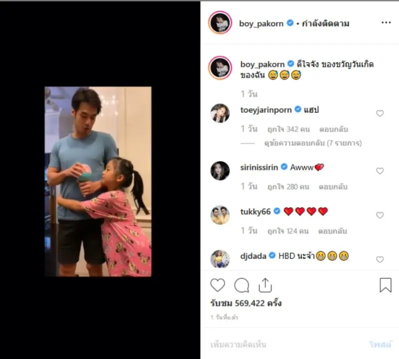โดยหนุ่มบอย ได้ลงคลิปวิดีโอในอินสตาแกรมส่วนตัว ซึ่งทางคุณแม่งามทิพย์เป็นคนถ่ายไว้ และในคลิปเป็นการสนทนาของหนุ่มบอยกับวันใหม่ ประมาณว่า อันนี้คือของขวัญวันเกิดผมเหรอ มันคือที่โปรยทานงานบวช คุณเอามาให้วันเกิดผมเหรอ แล้วไม่มีเทียนให้เป่าเหรอ ซึ่งน้องคนเล็กก็อวยพรด้วยว่า "ขอให้เฮียบอยมีความสุข รวยๆ นะคะ อายุยืนนาน จากนั้นบอยบอกว่าขอตั๋วไม่ต้องเกาหลังให้คุณ 1 อาทิตย์ หรือ 1 วันได้ไหม ซึ่งทางน้องวันใหม่ตอบเสียงดังชัดเจนว่า ไม่ได้ค่ะ พร้อมแคปชั่นว่า "ดีใจจัง ของขวัญวันเกิดของฉัน