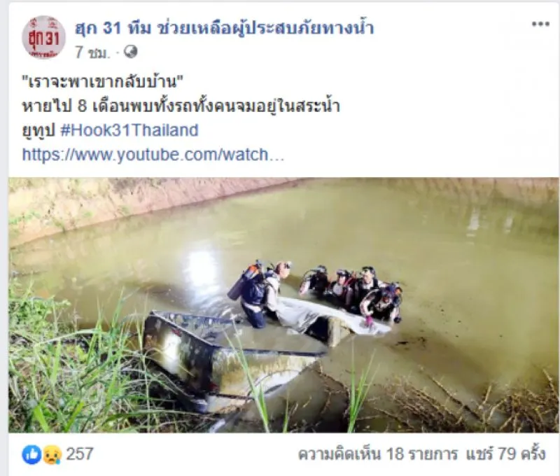 วันที่ 23 สิงหาคม 2562 ผู้สื่อข่าวรายงานว่า เพจเฟซบุ๊กชื่อ ฮุก 31 ทีม ช่วยเหลือผู้ประสบภัยทางน้ำ ได้โพสต์ภาพเหตุการณ์ของเจ้าหน้าที่ที่กำลังนำรถที่จมอยู่ในน้ำขึ้นมาบนฝั่ง โดยระบุข้อความว่า "เราจะพาเขากลับบ้าน" หายไป 8 เดือนพบทั้งรถทั้งคนจมอยู่ในสระน้ำ