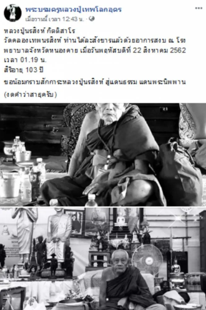 เมื่อวันที่ 22 สิงหาคม 2562 ที่ผ่านมา เพจเฟสบุคที่ใช้ชื่อว่า พระบรมครูหลวงปู่เทพโลกอุดร ได้โพสต์ข้อความพร้อมภาพบอกกล่าวถึงความสูญเสียของวงการพระสงฆ์ไทย โดยเฉพาะอย่างยิ่งเกี่ยวกับ พระอริยะสงฆ์ผู้ปฏิบัติดี เปี่ยมด้วยเมตตาธรรม คือ หลวงปู่นรสิงห์ กิตติสาโร วัดคลองเทพนรสิงห์ อ.เฝ้าไร่ จ.หนองคาย ว่า ท่านได้ละสังขารแล้วด้วยอาการสงบ ด้วยโรคชรา ณ โรงพยาบาลจังหวัดหนองคาย เมื่อวันพฤหัสบดีที่ 22 สิงหาคม 2562 เวลา 01.19 น. สิริอายุ 103 ปี ขอน้อมกราบสักการะหลวงปู่นรสิงห์ สู่แดนธรรม แดนพระนิพพาน (งดคำว่าสาธุครับ)