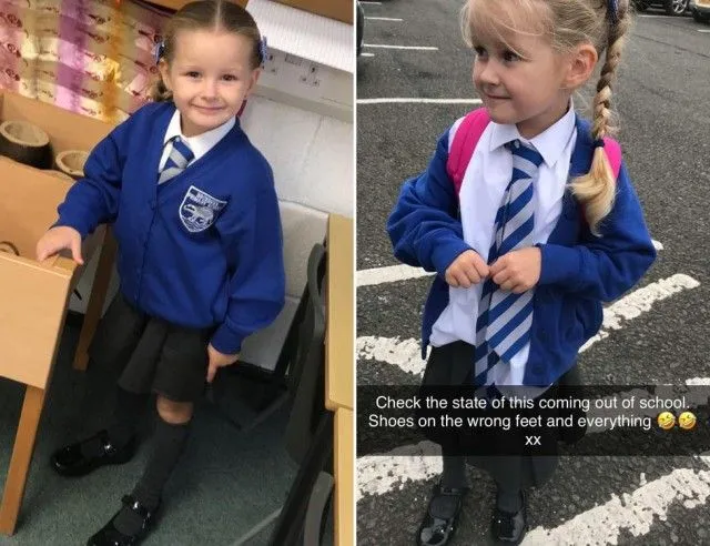 กลับบ้านมาในสภาพใส่รองเท้าผิดข้าง ภาพของลูซี่ทำให้เกิดกระแสพ่อแม่แชร์รูปก่อน-หลังไปโรงเรียนของลูก ๆ กันใหญ่ ลอร่า ชาวเมืองบร็อกซ์เบิร์น เป็นหนึ่งในคุณแม่ที่ตามกระแสด้วยการโพสต์รูปของลูกสาววัย 4 ขวบชื่อฮาร์เปอร์ที่กลับจากการไปโรงเรียนวันแรกในสภาพที่แตกต่างจากก่อนออกจากบ้านตอนเช้า ฮาร์เปอร์ตื่นเต้นมากที่ได้ใส่ชุดนักเรียนใหม่ไปโรงเรียนวันแรก ผมถักเปียตึงเรียบร้อย แต่หลังเลิกเรียน หนูน้อยฮาร์เปอร์อยู่ในสภาพผมยุ่ง เสื้อผ้ายับ ชายเสื้อหลุดออกนอกกระโปรง แถมยังใส่รองเท้าสลับข้างอีกต่างหาก หนูใส่รองเท้าสลับข้างนะฮาร์เปอร์” แม่ลอร่าเตือนลูกสาว แต่เธอดูไม่เดือดร้อนและตอบว่า ที่โรงเรียนสนุกมากเลยค่ะแม่