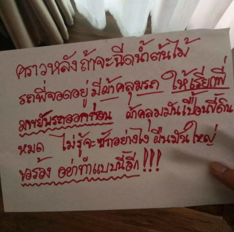เจ้าของกระทู้ยังอธิบายอีกว่า รถที่คลุมผ้าเเล้วเปื้อนนั่น accord hybrid tech รั้วบ้านผมสูง 3 เมตร ต้นไม้ที่รดน้ำ คือตีนตุ๊กเเก พุ่มที่รด คือ ต้นพุด สูงระดับเอวคลุมดินทั้งหมด ดินที่กระเด็นคาดว่า คือเศษดิน ฝุ่นที่อยู่ในร่องระบายน้ำครับ ตอนผมลากสายยางครับ ผมไม่ได้ฉีดน้ำนะ ใช้วิธีถือสายยาง ให้น้ำลงที่เเนวรั้วผม ยอมรับเลยครับตอนเห็นกระดาษนี่โกรธมาก เเต่คนที่เอามาเขียนแปะนี่ไม่อยู่บ้าน รถก็ไม่อยู่ เเต่ก็ยังเอาอีกคันมาจอดเเทน ถ้าเค้าอยู่นี่ท่าทางยาวเเน่ๆ