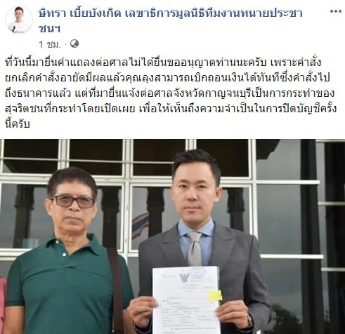 เวลาไล่เลี่ยกัน นายปรีชา ใคร่ครวญ หรือครูปรีชา พร้อมด้วยนายวรยุทธ บุญวงศ์ใส ทนายความ และนางรัตนาพร สุภาทิพย์ หรือเจ๊บ้าบิ่น ได้เดินทางมาถึงศาลเช่นกัน ต่างมีความมั่นใจเช่นกันว่า ศาลจะพิจารณามีคำสั่งไม่ถอนอายัดเงินที่อยู่ในธนาคาร เนื่องจากคดีอาญายังไม่สิ้นสุด กระทั่ง นายษิทรา เบี้ยบังเกิด หรือทนายตั้ม ได้โพสต์ลงเฟซบุ๊กส่วนตัว ว่า ศาลจังหวัดกาญจนบุรี ยกเลิกคำสั่งห้ามลุงจรูญเบิกถอนเงิน ให้ส่งหมายแจ้งไปยังธนาคารที่อายัดเงินไว้ ลุงจรูญสามารถถอนเงินที่ถูกอายัดได้แล้ว