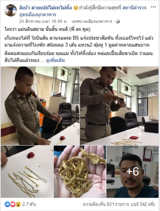 เรียกได้ว่าเป็นอีกหนึ่งเรื่องราวที่ชาวเน็ตแห่แชร์ และเข้ามาแสดงความคิดเห็นกันเป้นจำนวนมาก หลังมีผู้ใช้เฟสบุ๊คชื่อ อิเบ้า สายเปย์ไม่เทไม่ทิ้ง ได้ออกมาโพสต์ภาพพร้อมได้ระบุข้อความว่า ใครว่า แผ่นดินสยาม นั้นสิ้น คนดี (พี่ ตร.พูด) เก็บทองได้ที่ โรบินสัน ลานจอดรถ B5 แจ้งประชาสัมพันธ์ ทิ้งเบอร์โทรไว้ แล้วมาแจ้งความที่โรงพัก สร้อยคอ 3 เส้น แหวน 2 ตุ้มหู 1 มูลค่าหลายแสนบาท ติดต่อส่งมอบกันเรียบร้อย คุณแม่ ทั้งไห้ทั้งร้อง หล่อยเปี้ยเสียขาหมด ว่าจะไม่ได้คืนแล้วทอง คนมันจะหล่อ มันหล่อที่ข้างในครับ ใช่รูปลักใบหน้า ที่ภายนอก 5555