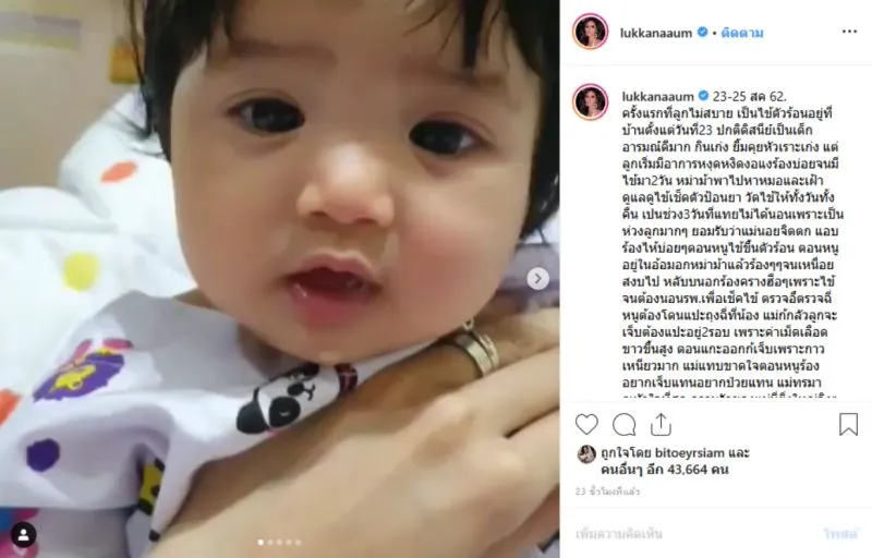 ล่าสุดน้องดิสนีย์ไม่สบายครั้งแรกจ้า ทำเอาแม่อุ้มใจคอไม่ดีเลยทีเดียว โดยได้ระบุข้อความว่า 23-25 สค 62. ครั้งแรกที่ลูกไม่สบาย เป็นไข้ตัวร้อนอยู่ที่บ้านตั้งแต่วันที่23 ปกติดิสนีย์เป็นเด็กอารมณ์ดีมาก กินเก่ง ยิ้มคุยหัวเราะเก่ง แต่ลูกเริ่มมีอาการหงุดหงิดงอแงร้องบ่อยจนมีไข้มา2วัน หม่าม้าพาไปหาหมอและเฝ้าดูแลดูไข้เช็ดตัวป้อนยา วัดไข้ให้ทั้งวันทั้งคืน เปนช่วง3วันที่แทยไม่ได้นอนเพราะเป็นห่วงลูกมากๆ ยอมรับว่าแม่นอยจิตตก แอบร้องไห้บ่อยๆตอนหนูไข้ขึ้นตัวร้อน ตอนหนูอยู่ในอ้อมอกหม่าม้าแล้วร้องๆๆจนเหนื่อยสงบไป หลับบนอกร้องครางฮือๆเพราะไข้ จนต้องนอนรพ.เพื่อเช็คไข้ ตรวจอึตรวจฉี่ หนูต้องโดนแปะถุงฉี่ที่น้อง แม่ก้กลัวลูกจะเจ็บต้องแปะอยู่2รอบ เพราะค่าเม็ดเลือดขาวขึ้นสูง ตอนแกะออกก้เจ็บเพราะกาวเหนียวมาก แม่แทบขาดใจตอนหนูร้อง อยากเจ็บแทนอยากป่วยแทน แม่ทรมาณหัวใจที่สุด ความรักของแม่นี่ยิ่งใหญ่จิงๆนะ เหนื่อยเครียดเพลียแค่ไหนก้ยังมีแรงเฮือกขึ้นมาได้จากรอยยิ้มอ้อมกอดของหนู สัมผัสของหนูเวลาเข้าเต้าเวลาหนูร้องมองหาแม่ แม่ขอให้หนูแข็งแรงๆไม่เจ็บไข้ได้ป่วยนะคะ แม่รักหนูและจะอยู่ดูแลหนูเสมอ
