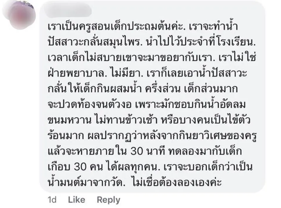 จากกรณีที่เพจเฟซบุ๊ก “หมอแล็บแพนด้า” ได้ออกมาโพสต์รูปภาพของครูสาวรายหนึ่งที่โพสต์ข้อความ ว่าตนเองนำน้ำปัสสาวะผสมสมุนไพรมาแจกเด็กนักเรียน สำหรับเวลาที่เด็กไม่สบาย และมาขอยากับตนเองตนเองก็จะนำน้ำดังกล่าวให้เด็กกิน และพบว่าเด็กส่วนใหญ่เมื่อรับประทานน้ำปัสสาวะผสมสมุนไพรอาการไม่สบายจะหายไปทันที โดยจะหลอกเด็กว่าเป็นน้ำมนต์มาจากวัด