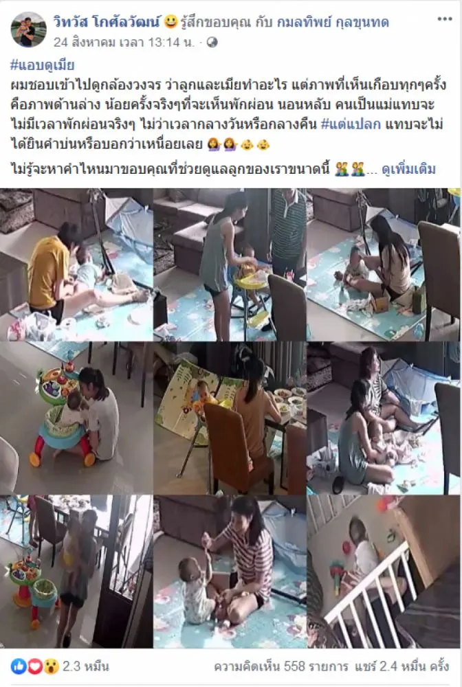 โดยได้โพสต์เล่าว่า แอบดูเมีย ผมชอบเข้าไปดูกล้องวงจรปิด ว่าลูก และเมียทำอะไร แต่ภาพที่เห็นเกือบทุกๆ ครั้งคือภาพด้านล่าง น้อยครั้งจริงๆ ที่จะเห็นพักผ่อน นอนหลับ คนเป็นแม่แทบจะไม่มีเวลาพักผ่อนจริงๆ ไม่ว่าเวลากลางวันหรือกลางคืน แต่แปลก แทบจะไม่ได้ยินคำบ่นหรือบอกว่าเหนื่อยเลย