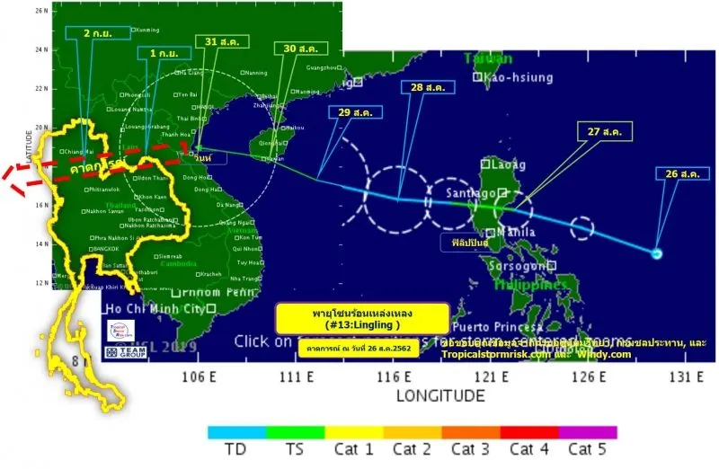 ในวันที่เสาร์ที่ 31 ส.ค.ต่อกับเช้าวันที่ 1 ก.ย. พายุจะเคลื่อนตัวมาถึง นครพนม จะทำให้ฝนตกหนัก หนักถึงหนักมาก เรียงตามเวลาตั้งแต่ 31 ส.ค. ที่ นครพนม สกลนคร บึงกาฬ หนองคาย อุดรธานี เลย เพชรบูรณ์ น่าน แพร่ สุโขทัย ลำปาง เชียงใหม่ ตาก แม่ฮ่องสอน ถึงวันที่ 2 ก.ย. ตามลำดับเวลา