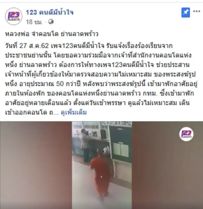 วันที่ 27 ส.ค.62 เพจ123คนดีมีน้ำใจ รับแจ้งเรื่องร้องเรียนจากประชาชนย่านนั้น โดยขอความร่วมมือจากเจ้าที่สำนักงานคอนโดแห่งหนึ่ง ย่านลาดพร้าว ต้องการให้ทางเพจ123คนดีมีน้ำใจ ช่วยประสานเจ้าหน้าที่ผู้เกี่ยวข้องให้มาตรวจสอบความไม่เหมาะสม ของพระสงฆ์รูปหนึ่ง อายุประมาณ 50 กว่าปี หลังพบว่าพระสงฆ์รูปนี้ เข้ามาพักอาศัยอยู่ภายในห้องพัก ของคอนโดแห่งหนึ่งย่านลาดพร้าว กทม. ซึ่งเข้ามาพักอาศัยอยู่หลายเดือนแล้ว ตั้งแต่วันเข้าพรรษา ดูแล้วไม่เหมาะสม เดินเข้าออกคอนโด ถอดจีวร สวมเพียงอังสะ เดินเข้าออกภายในคอนโด บ้างก็ลงมาซักผ้า เลยอยากให้มีหน่วยงานที่เกี่ยวข้องจัดการเรื่องนี้