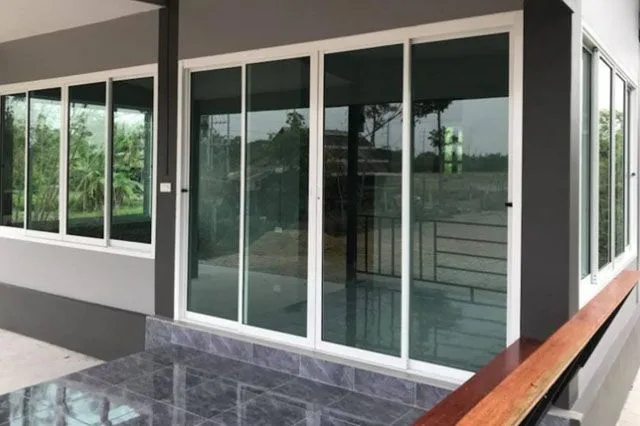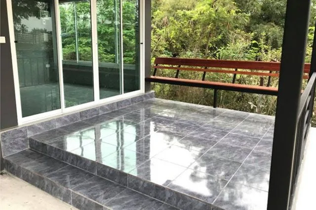 เฉลียงหน้าบ้านปูด้วยกระเบื้องสีหินอ่อน มีม้านั่งยาวสีน้ำตาล พร้อมพนักพิง ไว้ให้นั่งพักผ่อนหย่อนใจ หรือเป็นพื้นที่ทำกิจกรรมของสมาชิกในครอบครัวก็ได้
