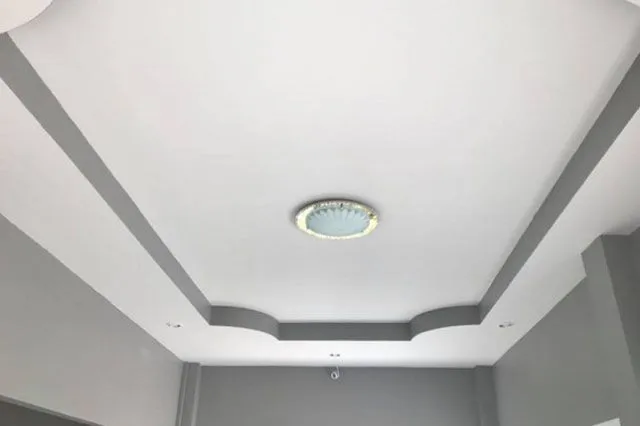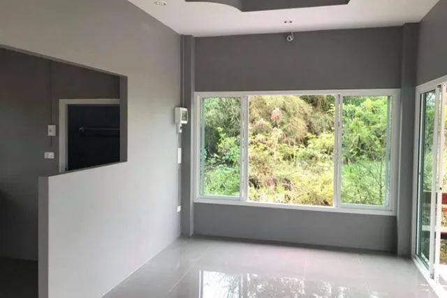 เพื่อไม่ให้บ้านไม่ดูอึมครึมจนเกินไป ภายในตัวบ้านทาด้วยสีเทาอ่อน ๆ ในส่วนกระเบื้องก็เป็นสีขาว มีการจัดเป็นสัดส่วนได้อย่างลงตัว ทำให้บ้านดูสะอาด น่าอยู่ พร้อมด้วยฝ้าหลุมบนเพดาน สวยใสมีสไตล์ ยิ่งทำให้บ้านสวยงามมากยิ่งขึ้น และจะสวยกว่านี้เวลาค่ำคืนด้วยโคมไฟตกแต่ง