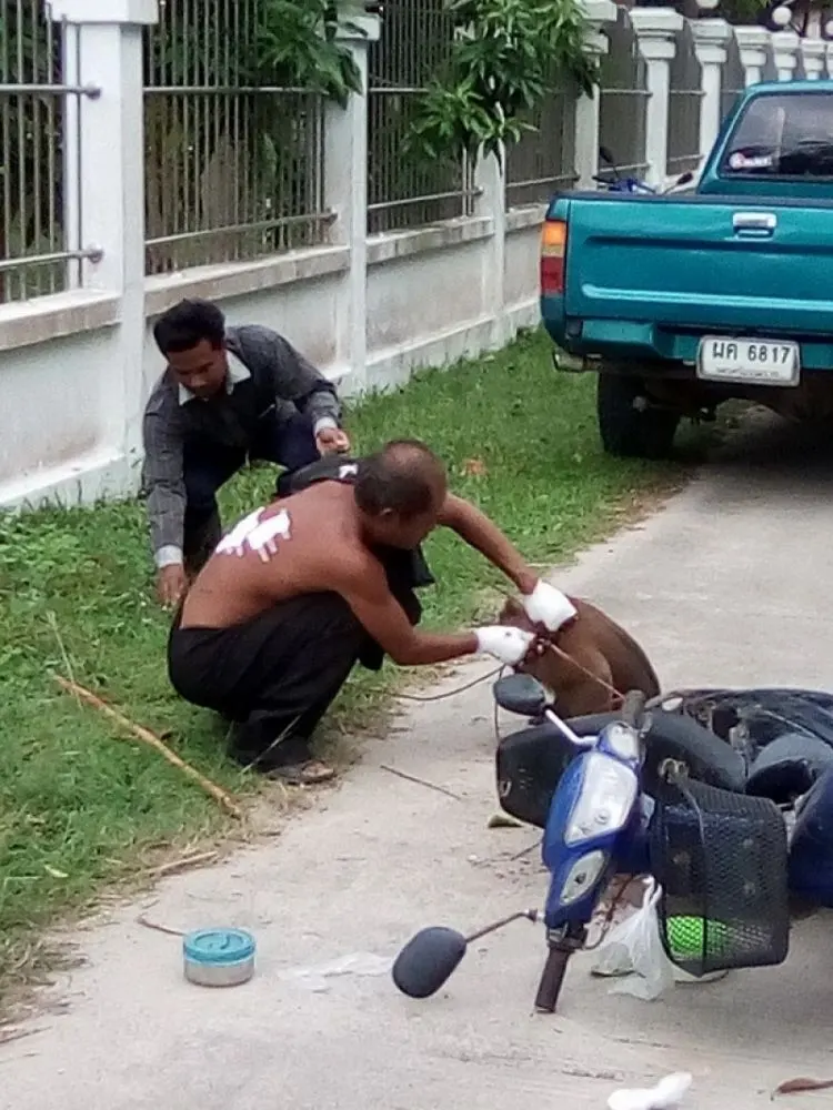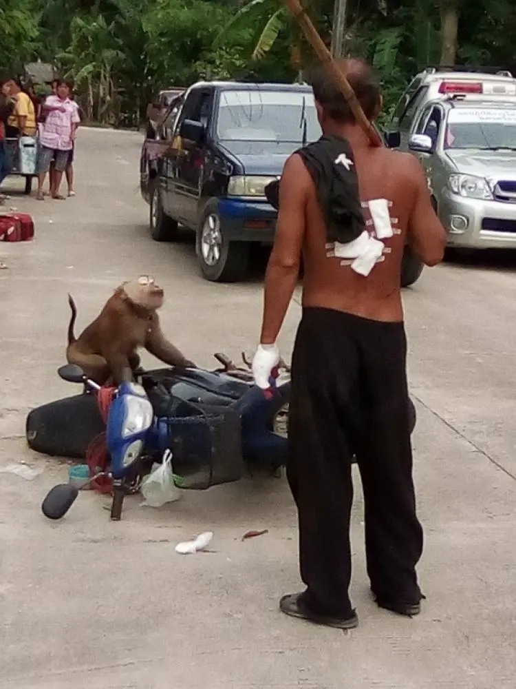 ลิงหัวร้อน โมโหเจ้าของพาขี่รถล้ม กัดแผลเหวอะหวะ ต้องกล่อมอยู่นานกว่าจะสงบ