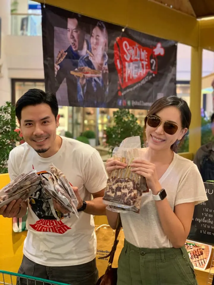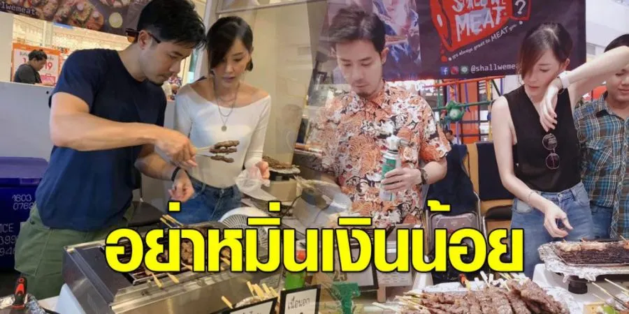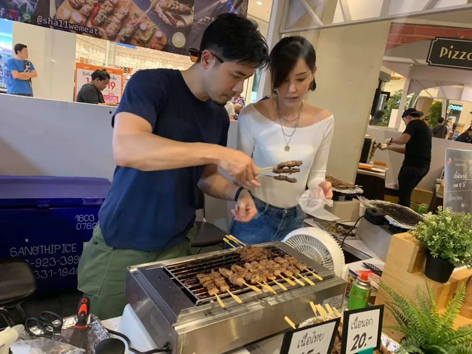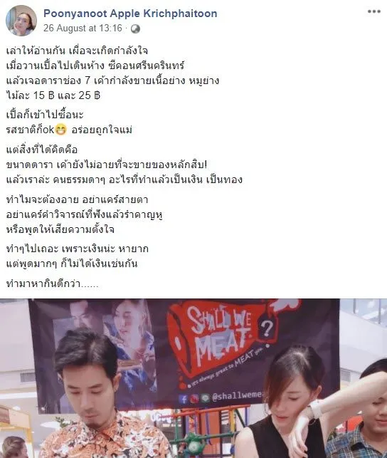 "เล่าให้อ่านกัน เผื่อจะเกิดกำลังใจ เมื่อวานเปิ้ลไปเดินห้าง ซีคอนศรีนครินทร์ แล้วเจอดาราช่อง 7 เค้ากำลังขายเนื้อย่าง หมูย่าง ไม้ละ 15 ฿ และ 25 ฿