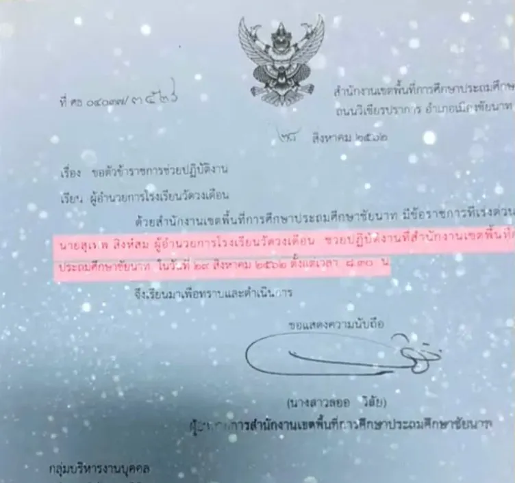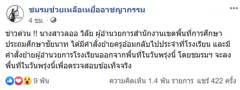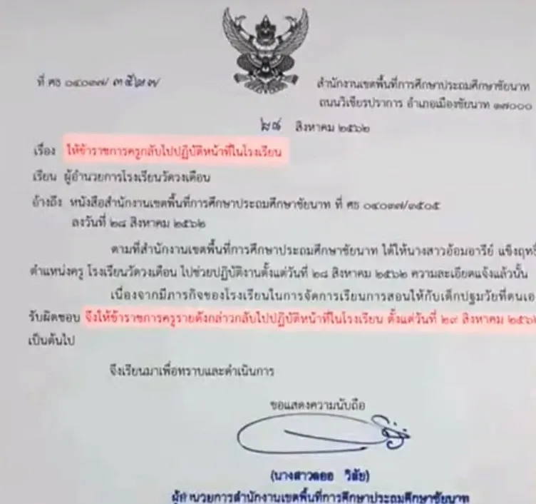ข่าวด่วน นางสาวลออ วิลัย ผู้อำนวยการสำนักงานเขตพื้นที่การศึกษาประถมศึกษาชัยนาท ได้มีคำสั่งย้ายครูอ้อมกลับไปประจำที่โรงเรียน และมีคำสั่งย้ายผู้อำนวยการโรงเรียนออกจากพื้นที่ในวันพรุ่งนี้ โดยชมรมฯ จะลงพื้นที่ในวันพรุ่งนี้เพื่อตรวจสอบข้อเท็จจริง