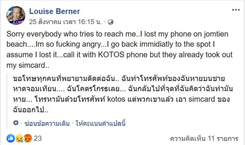 ขอโทษทุกคนที่พยายามติดต่อฉัน ฉันทำโทรศัพท์ของฉันหายบนชายหาดจอมเทียน ฉันโกรธมาก ฉันกลับไปที่จุดที่ฉันคิดว่าฉันทำมันหาย โทรหามันด้วยโทรศัพท์ kotos แต่พวกเขาเอา simcard ของฉันออกไป