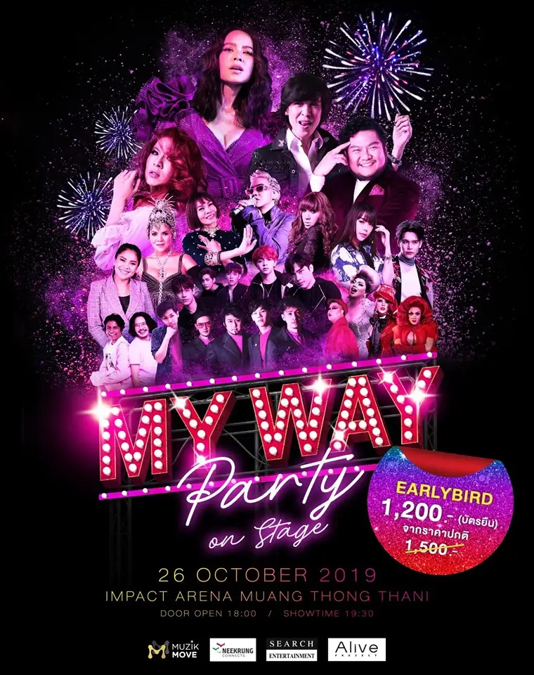 ครั้งแรกของเมืองไทยปาร์ตี้คอนเสิร์ตที่ไม่ใช่แค่ร้องเพลง แต่เป็น CONCERT + AFTER PARTY กับ My Way Party on Stage เปรี้ยวให้สุดกับงานที่รวมไอดอลของทุกเพศทุกวัยที่ยกทัพกันมาแดนซ์ให้สุดเหวี่ยง กับมาช่า วัฒนพาณิช, เบน ชลาทิศ, จีน กษิดิศ, ดัง พันกร, พีท พลและอีกมากมาย ปิดท้ายกับปาร์ตี้สุดมันส์แบบ Non Stop กับสุดยอดนักจัดปาร์ตี้ Trasher และ โชว์สุดอลังการ Drag Race Thailand พร้อมแขกรับเชิญสุดเซอร์ไพร์ส ที่คุณต้องซี้ดปากอย่างแน่นอน พิเศษ!!! เปิดขายบัตร Early Bird วันจันทร์ที่ 26 สิงหาคมนี้ บัตรยืนราคาเพียง 1,200 บาท จาก 1,500 บาท จำนวนจำกัด บัตรราคาปกติเปิดจำหน่ายพร้อมกัน วันที่ 1 กันยายน 2562 นี้ ที่ไทยทิคเก็ตเมเจอร์ทุกสาขา