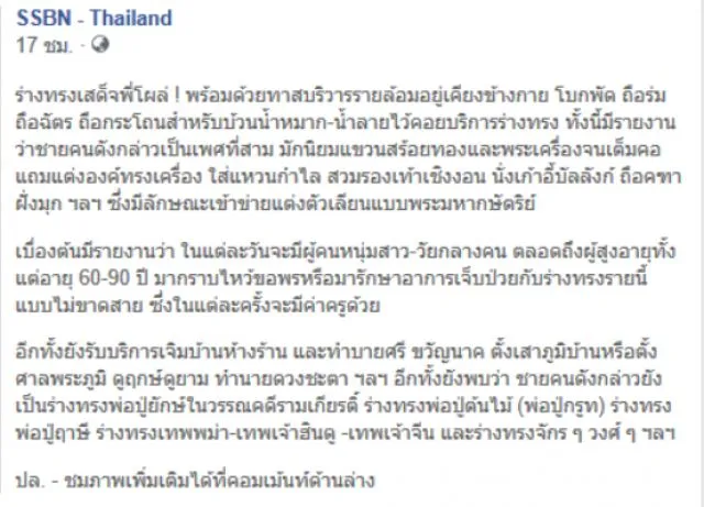 ในสังคมเราทุกวันนี้ก็ยังคงเชื่อเรื่องการทรงเจ้ากันอยู่เป็นจำนวนมาก และวันนี้ก็พบว่ามีร่างทรงแปลกๆโผล่มาให้เราได้เห็นกันอยู่เรื่อยๆ แต่ว่าเราไม่ได้ลบหลู่แต่อย่างใด ทั้งหมดนี้ล้วนแล้วเป็นความเชื่อส่วนบุคคล เมื่อวันที่ 28 สิงหาคม ที่ผ่านมา เพจ SSBN - Thailand ได้โพสต์ข้อความระบุ่ว่า ร่างทรงเสด็จพี่โผล่ พร้อมด้วยทาสบริวารรายล้อมอยู่เคียงข้างกาย โบกพัด ถือร่ม ถือฉัตร ถือกระโถนสำหรับบ้วนนํ้าหมาก-นํ้าลายไว้คอยบริการร่างทรง ทั้งนี้มีรายงานว่าชายคนดังกล่าวเป็นเพศที่สาม มักนิยมแขวนสร้อยทองและพระเครื่องจนเต็มคอ แถมแต่งองค์ทรงเครื่อง ใส่แหวนกำไล สวมรองเท้าเชิงงอน นั่งเก้าอี้บัลลังก์ ถือคฑาฝังมุก ฯลฯ ซึ่งมีลักษณะเข้าข่ายแต่งตัวเลียนแบบพระมหากษัตริย์