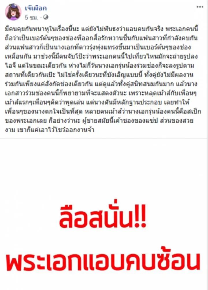 ทำเอาโซเชียลลุกเป็นไฟไปแล้วจ้า หลังมีกรณีมีข่าวลือหนาหูพระเอกดังแอบคบซ้อน โดยผู้ใช้เพจเฟซบุ๊กชื่อ เจ๊เผือก ได้ออกมาโพสต์ข้อความระบุว่า มีคนคุยกันหนาหูในเรื่องนี้นะ แต่ยังไม่ฟันธงว่าแอบคบกันจริง พระเอกคนนี้ถือว่าเป็นเบอร์ต้นๆของช่องที่ออกสื่อรักหวานชื่นกับแฟนสาวที่กำลังคบกัน ส่วนแฟนสาวก็เป็นนางเอกที่ดาวรุ่งพุ่งแทรงขึ้นมาเป็นเบอร์ต้นๆของช่องเหมือนกัน มาช่วงนี้มีคนจับโป๊ะว่าพระเอกคนนี้ไปเที่ยวไหนมักจะถ่ายรูปลงไอจี แต่ในขณะเดียวกัน ห่างไม่กี่วันนางเอกรุ่นน้องร่วมช่องก็จะลงรูปตาม สถานที่เดียวกันเป๊ะ ไม่ใช่ครั้งเดียวนะที่บังเอิญแบบนี้ ทั้งคู่ยังไม่มีผลงานร่วมกันเพียงแค่สังกัดช่องเดียวกัน แต่ดูแล้วทั้งคู่สนิทสนมกันมาก แล้วนางเอกสาวร่วมช่องคนนี้ก็พยายามที่จะแสดงตัวนะ เพราะหลุดเม้าส์กับเพื่อนๆ เม้าส์แรกๆเพื่อนๆคิดว่าพูดเล่น แต่นางดันมีหลักฐานประกอบ เลยทำให้เพื่อนๆของนางตกใจเป็นที่สุด หลายคนเม้าส์ว่านางเอกรุ่นน้องคนนี้คือสเป็กของพระเอกเลย ก็อย่างว่านะ ผู้ชายสมัยนี้เค้าชองของแซ่ป ส่วนของสวยงาม เขาก็แค่เอาไว้โชว์ออกงานจ้า