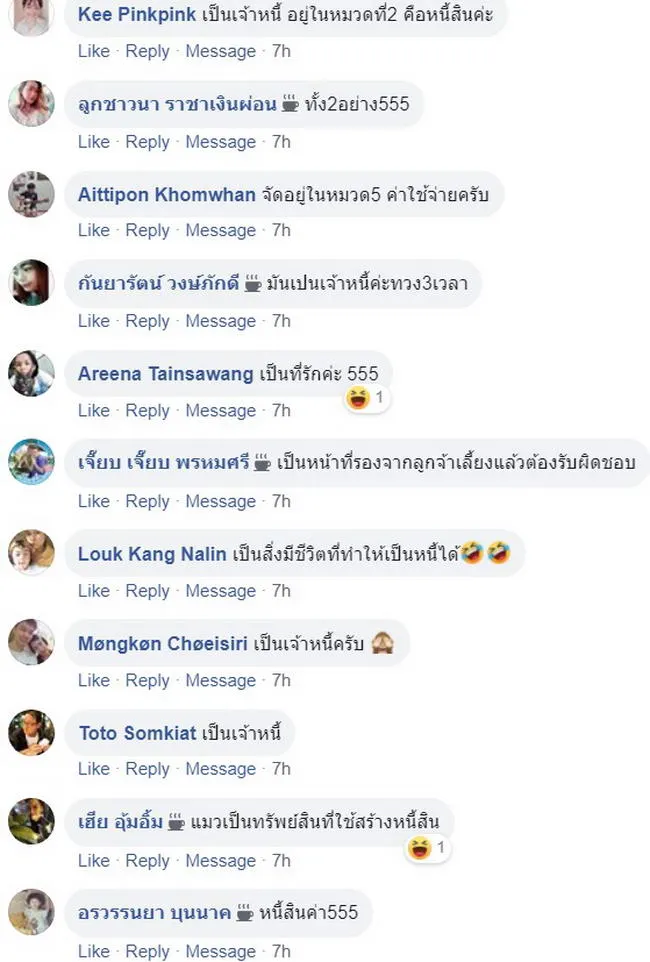 โพสต์ดังกล่าวมีชาวเนตคอมเม้นท์กันอย่างมากมายหลายร้อย และส่วนใหญ่ยืนยันแล้วว่าแมวเป็นเจ้าหนี้ของพวกเรา ที่ไม่ว่าจะหาใช้ให้อย่างไรก็ไม่มีวันหมดซักที