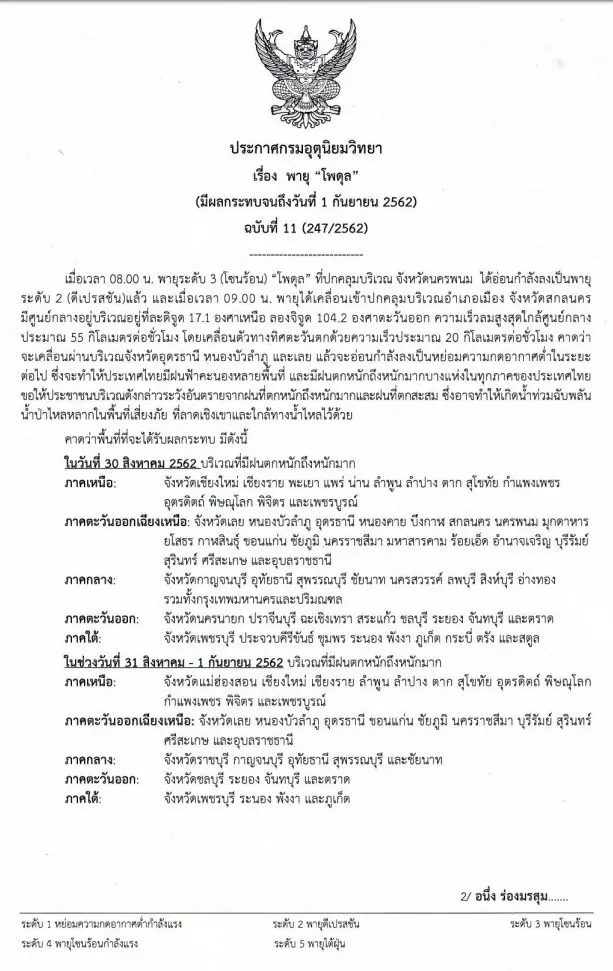 วันที่ 30 สิงหาคม 2562 ผู้สื่อข่าวสยามนิวส์รายงานว่า เว็ปไซต์ กรมอุตุนิยมวิทยา ได้โพสต์ประกาศเตือนพายุ โพดุล ฉบับที่ 11 ลงวันที่ 30 สิงหาคม 2562 โดยระบุว่า เมื่อเวลา 08.00 น. พายุระดับ 3 (โซนร้อน) “โพดุล” ที่ปกคลุมบริเวณ จังหวัดนครพนม ได้อ่อนกำลังลงเป็นพายุระดับ 2 (ดีเปรสชัน)แล้ว และเมื่อเวลา 09.00 น. พายุได้เคลื่อนเข้าปกคลุมบริเวณอำเภอเมือง จังหวัดสกลนคร มีศูนย์กลางอยู่บริเวณอยู่ที่ละติจูด 17.1 องศาเหนือ ลองจิจูด 104.2 องศาตะวันออก ความเร็วลมสูงสุดใกล้ศูนย์กลางประมาณ 55 กิโลเมตรต่อชั่วโมง โดยเคลื่อนตัวทางทิศตะวันตกด้วยความเร็วประมาณ 20 กิโลเมตรต่อชั่วโมง คาดว่าจะเคลื่อนผ่านบริเวณจังหวัดอุดรธานี หนองบัวลำภู และเลย แล้วจะอ่อนกำลังลงเป็นหย่อมความกดอากาศต่ำในระยะต่อไป ซึ่งจะทำให้ประเทศไทยมีฝนฟ้าคะนองหลายพื้นที่ และมีฝนตกหนักถึงหนักมากบางแห่งในทุกภาคของประเทศไทย ขอให้ประชาชนบริเวณดังกล่าวระวังอันตรายจากฝนที่ตกหนักถึงหนักมากและฝนที่ตกสะสม ซึ่งอาจทำให้เกิดน้ำท่วมฉับพลัน น้ำป่าไหลหลากในพื้นที่เสี่ยงภัย ที่ลาดเชิงเขาและใกล้ทางน้ำไหลไว้ด้วย