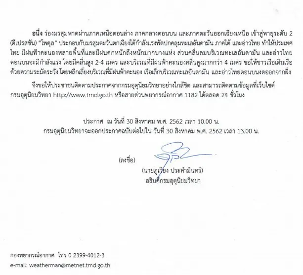 กรมอุตุนิยมวิทยาจะออกประกาศฉบับต่อไปใน วันที่ 30 สิงหาคม พ.ศ. 2562 เวลา 13.00 น.