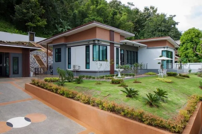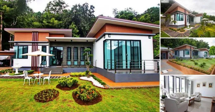 บ้านยกระดับ สไตล์เดิร์น ขนาด 3 ห้องนอน 2 ห้องน้ำ มีขนาดหน้ากว้าง 15 เมตร ลึก 14 เมตร ครบทุกพื้นที่ใช้สอย พร้อมทั้งสนามหญ้าบ้าน ที่จัดได้อย่างสวยงาม บรรยายกาศรอบบ้านมีความร่มรื่น ล้อมรอบด้วยตันไม้ และโรงรถที่มีขนาดกว้าง สามารถจอดได้ถึง 2 คัน